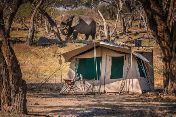 African safari tented camp with no fences. Elephant walking in the camp.
