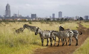 The city skyline is seen behind a group of zebras in the Nairobi National Park in Nairobi, Kenya, where, lions, rhinos and other animals roam just miles from downtown.